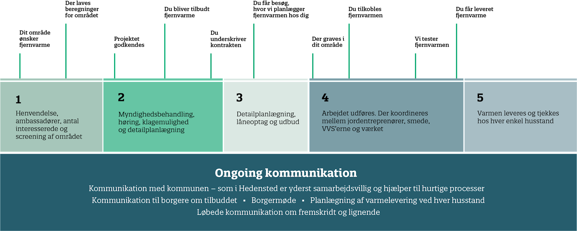 Som fjernvarmeværk kan vi ikke bare beslutte, hvilket område vi vil levere fjernvarme til. Og heldigvis for det. Det skal nemlig dokumenteres, at det er en god forretning for både nuværende forbrugere, nye forbrugere, varmeselskabet og samfundet generelt. Og så skal der være mulighed for at lave indvendinger som lokal borger. Først når de punkter er på plads, kan projektet planlægges. Så hvordan forgår processen fra start til slut?
